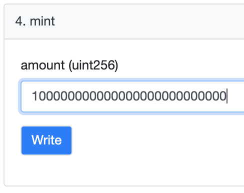 14. Mint 섹션으로 페이지를 이동하고 발행할 토큰 수를 입력합니다. 우리는 100,000,000 BAC를 주조할 것입니다. 이 경우에는 소수점도 잊지 마세요. 18. [쓰기]를 클릭하고 메타마스크에서 수수료를 지불하세요.