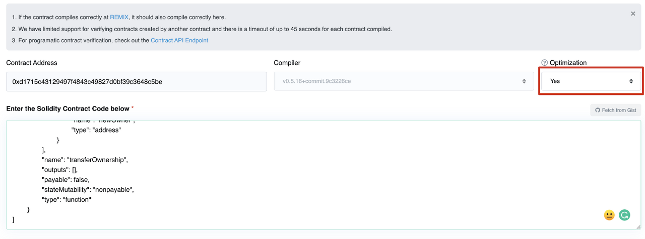 12. BEP20_flat.sol에서 필드로 코드를 복사하고 [최적화]가 예로 설정되었는지 확인합니다. 이제 페이지 하단의 [확인 및 게시]를 클릭합니다.
