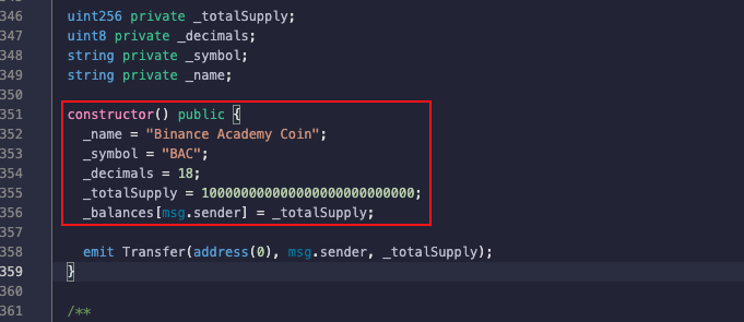 6. 코인의 이름, 기호, 소수점 및 totalSupply를 수정합니다. 여기에서는 소수점 이하 18자리와 총 공급량이 100,000,000인 바이낸스 아카데미 코인(BAC)을 예로 선택했습니다. 소수점 이하 18자리를 덮을 수 있도록 충분한 0을 추가하는 것을 잊지 마십시오.
