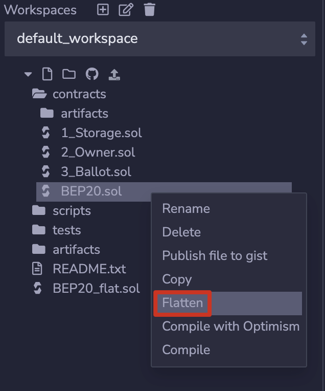 11. 그런 다음 Remix에서 BEP20.sol을 마우스 오른쪽 버튼으로 클릭하고 [Flatten]을 누릅니다. 그런 다음 코드를 병합하려면 Remix 권한을 부여해야 합니다.