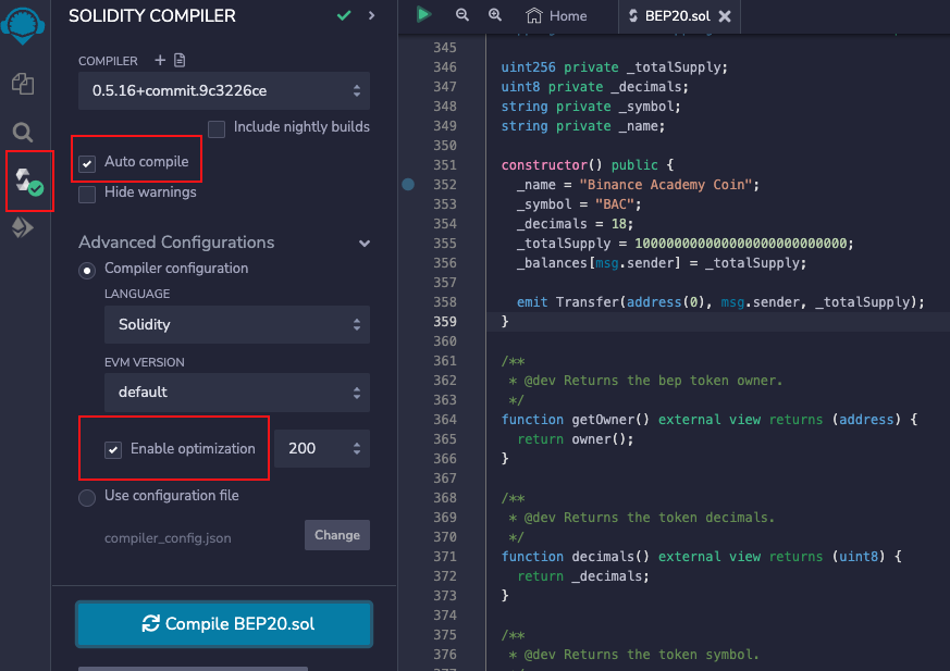 7. 다음으로 스마트 계약을 컴파일해야 합니다. 화면 왼쪽 아래에 보이는 아이콘을 클릭하여 [자동 컴파일]과 [최적화 활성화]를 체크한 후 [컴파일] 버튼을 클릭합니다.